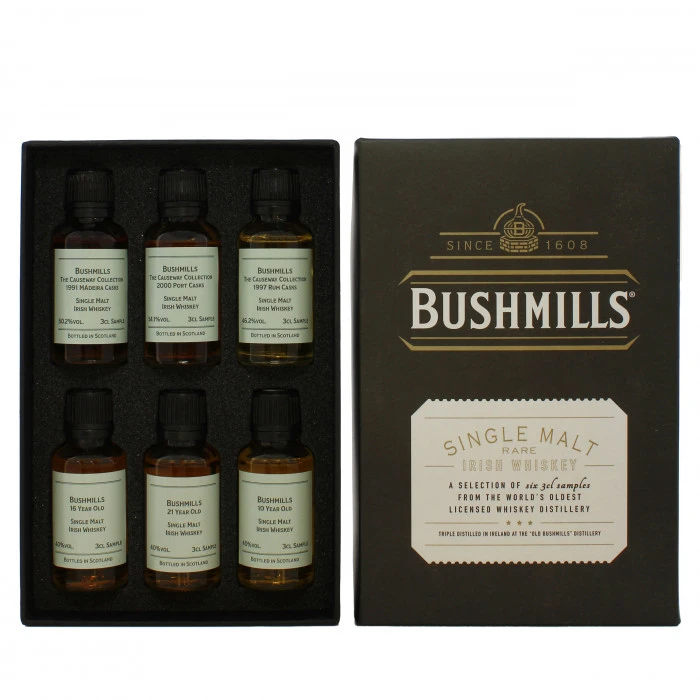 May we present the ultimate introduction to Bushmills Irish Whiskey. This six-piece 3cl set contains three expressions from their core range, 10 Year Old, 16 Year Old and 21 Year Old, as well as three extra-special limited editions. From the The Causeway Collection, we have 1991 Madeira Casks, 1997 Rum Casks and 2000 Port Casks. These three were bottled in 2022.