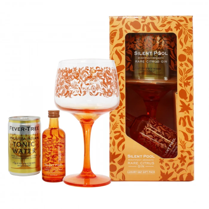 Impress the gin lover in your life with this stylish set which comes equipped with a 5cl bottle of Silent Pool Rare Citrus Gin, a matching Copa gin glass, and a can of Fever Tree Tonic Water.